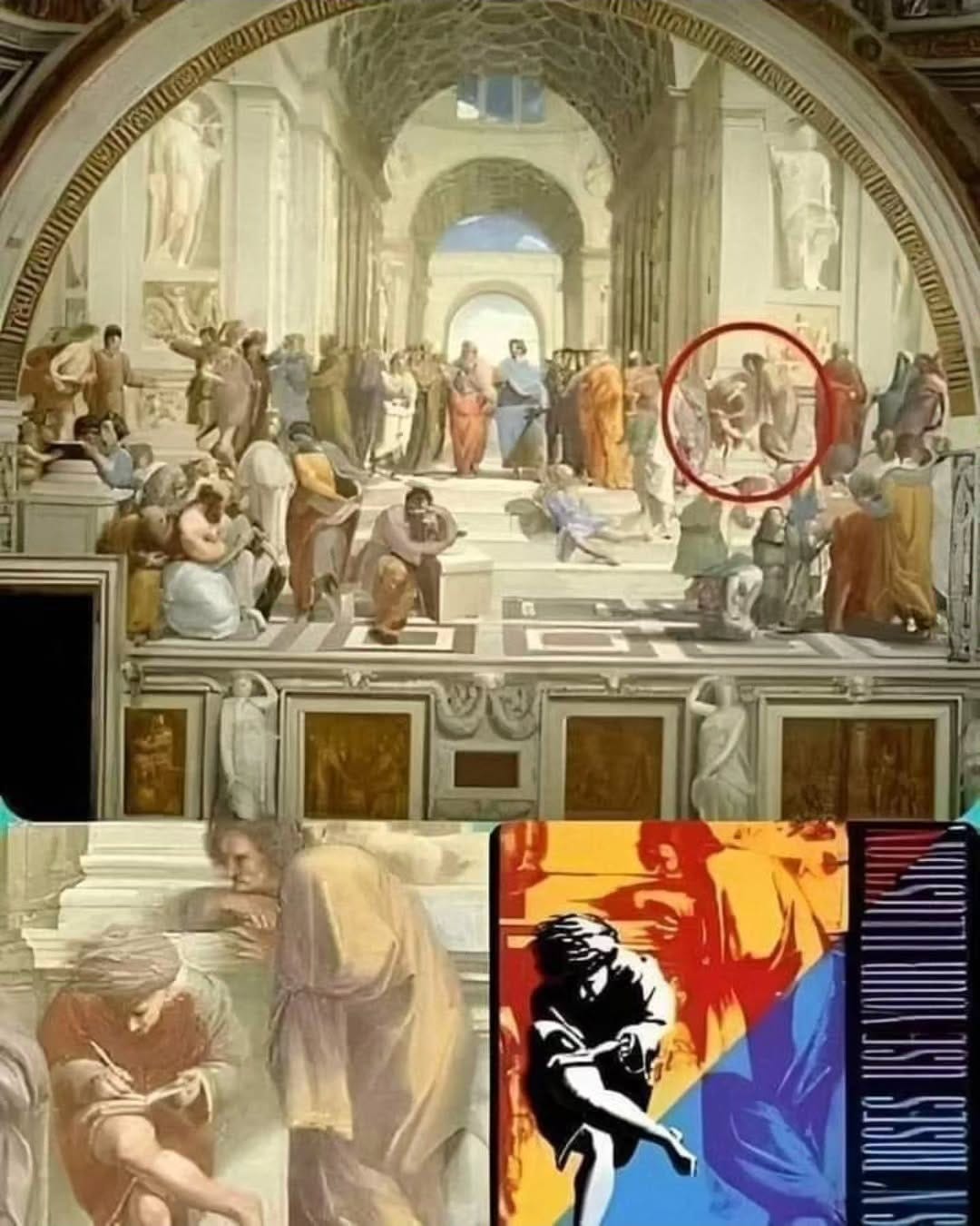 La portada del álbum "Use Your Illusion" de Guns N' Roses está inspirada en una parte del famoso fresco "La Escuela de Atenas" de Rafael. Esta obra maestra renacentista, creada entre 1509 y 1511, representa a grandes filósofos y científicos de la antigüedad reunidos en un mismo espacio. En la portada del álbum, una figura del fresco de Rafael es reinterpretada con un estilo moderno, destacando la conexión entre el arte clásico y la cultura contemporánea.