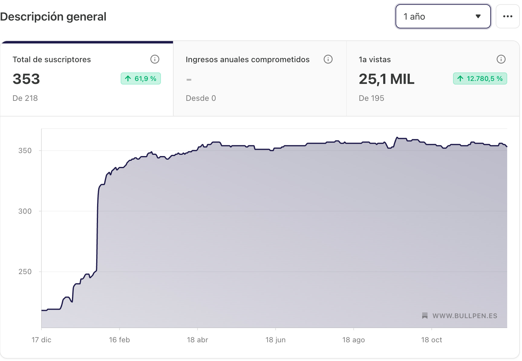Esta nueva etapa empezó con 219 suscriptores. Poco a poco fue creciendo hasta los 360 —los 320 llegaron casi de golpe, seguramente por alguna recomendación—. A partir de ahí, el número se ha movido de forma bastante estable entre los 350 y los 360, sin grandes empujes ni caídas. Una meseta clara.